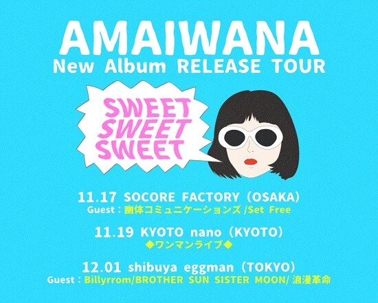 2023年10月18日に“アマイワナ”が配信ミニアルバム『SWEET SWEET SWEET』をリリースしました。今作には、今年リリースされた「恋泥棒」「上海逢引」を含む全7曲が収録されております。ピチカート・ファイヴのカバー「メッセージ・ソング」も必聴。さらに、自身初となるツアー『SWEET SWEET SWEET RELEASE TOUR』を大阪、東京で開催!